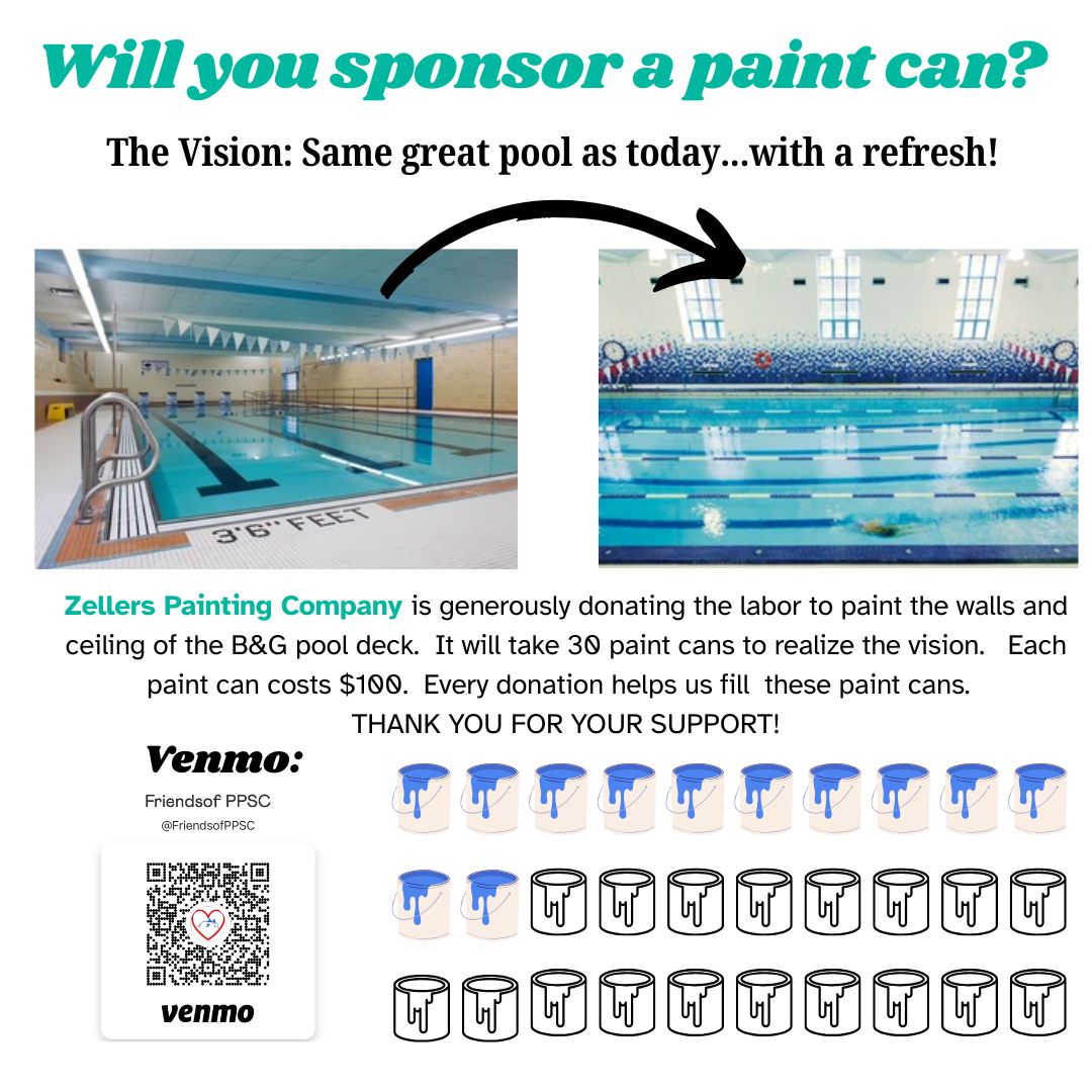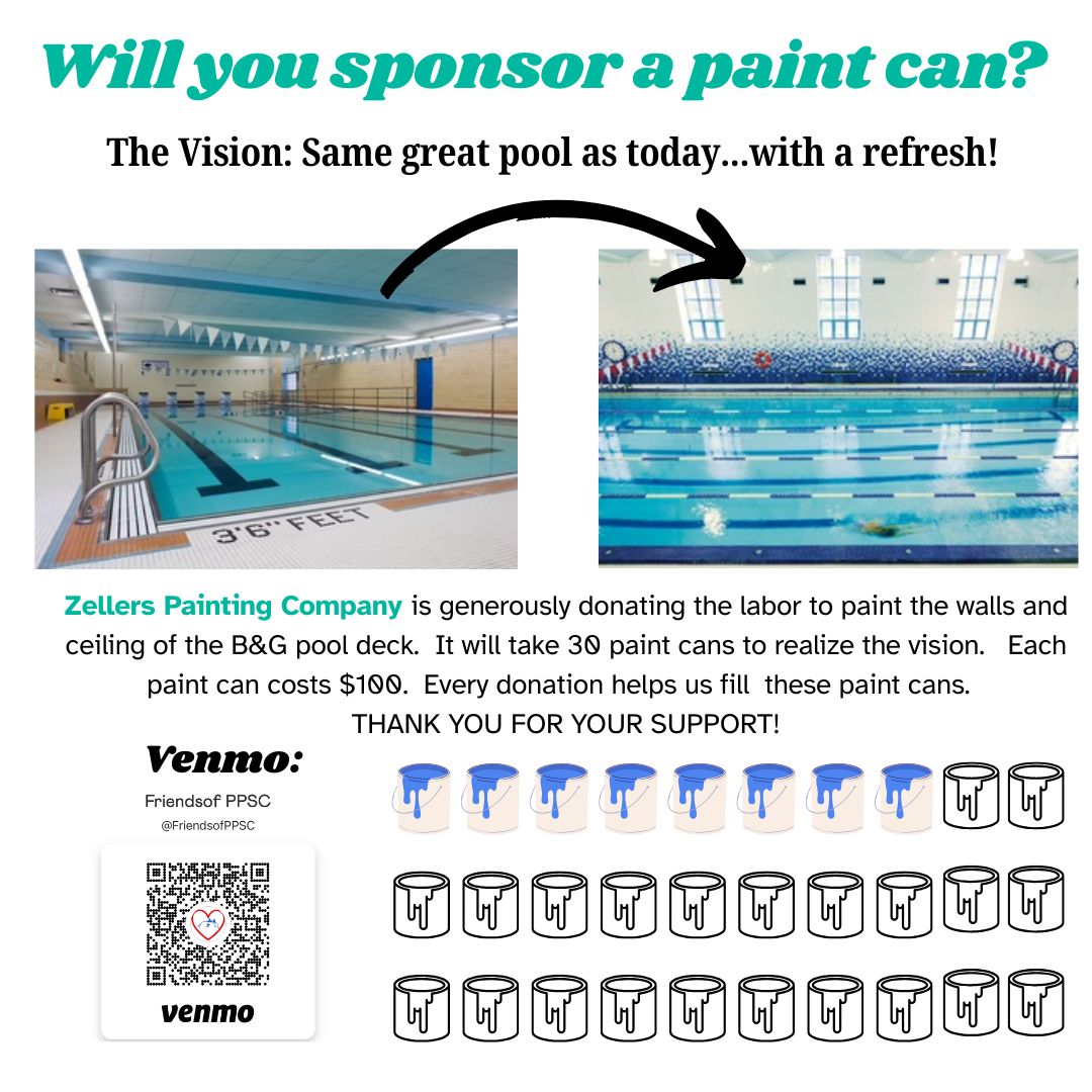 Donation for paint: Every paint can costs about $100 (these have already been deeply discounted by Sherman Williams) and we need about 30 cans. The Friends of PPSC have funds available to contribute but we are asking families and friends of Porpoises, B&G and the aquatics community to consider sponsoring a can (or a portion of a can) via Venmo to Friends of PPSC. See flyer for pictures of the "after" as well as Venmo QR code for easy donation.